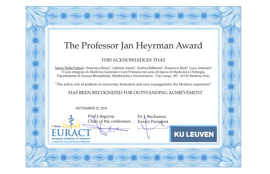 EURACT 2018: L’ESPERIENZA DI MODENA VINCE IL “PROFESSOR JAN HEYRMAN AWARD”!